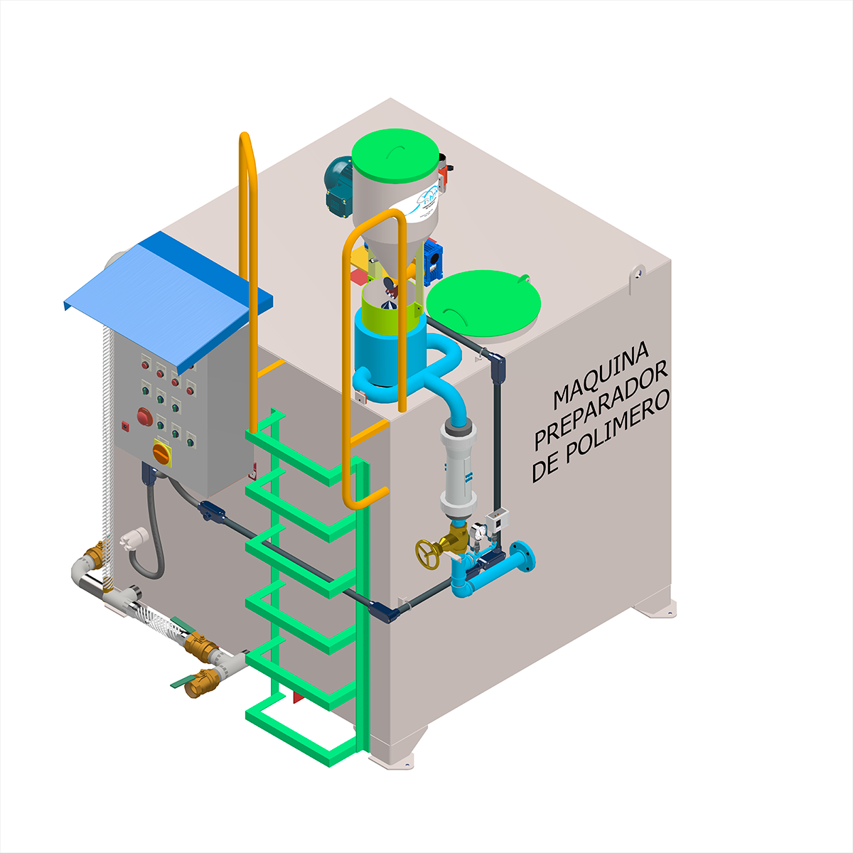 Una máquina preparadora de polímero sirve para automatizar y optimizar la preparación de soluciones de polímeros (también llamados floculantes o polielectrolitos), que son agentes químicos esenciales en diversos procesos industriales, especialmente en el tratamiento de aguas y lodos. Estas máquinas disuelven de manera eficiente el polímero, ya sea en polvo o líquido, en agua para crear una solución homogénea y con la concentración adecuada.